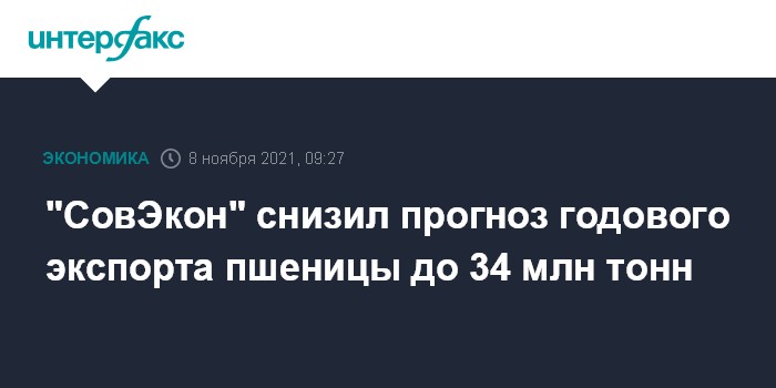 Москва. 8 ноября. INTERFAX.RU - "СовЭкон" снова раз снизил прогноз экспорта пшеницы из России в текущем сельхозгоду (с июля 2021 года по июнь 2022 года), до 34 млн тонн. Предыдущий прогноз компании был на 0,3 млн тонн выше. "СовЭкон" объяснил, что снизил ожидания по урожаю и учел вялые темпы экспорта.