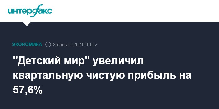 Москва. 8 ноября. INTERFAX.RU - В III квартале 2021 года чистая прибыль ПАО "Детский мир" по МСФО выросла на 57,6% в годовом измерении и составила 3,665 млрд рублей.