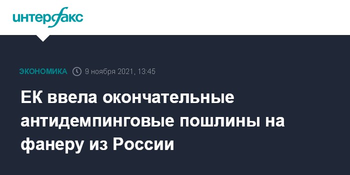 В июне ЕК одобрила введение на 6 месяцев предварительных антидемпинговых пошлин в отношении российской березовой фанеры. Размер пошлины варьировался от 15% до 15,9% в зависимости от производителя. Решение о введении антидемпинговой пошлины было принято по итогам расследования, инициированного Еврокомиссией в октябре 2020 года. Жалобу на демпинг со стороны российских компаний подали в августе прошлого года крупные производители фанеры из Польши и Латвии.