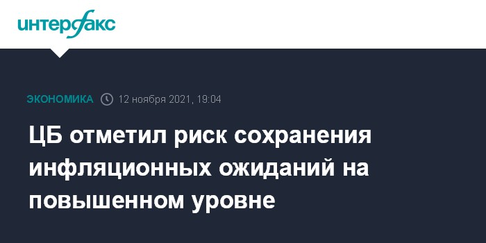 Москва. 12 ноября. INTERFAX.RU - Банк России отмечает риск сохранения инфляционных ожиданий на повышенном уровне в силу ряда факторов, говорится в комментарии регулятора.