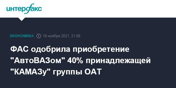 Москва. 16 ноября. INTERFAX.RU - ФАС РФ удовлетворила ходатайство "АвтоВАЗа" о приобретении 40-процентной доли в принадлежащей "КАМАЗу" автокомпонентной группе предприятий "Объединенные автомобильные технологии" (ОАТ).