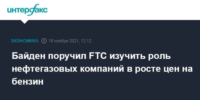 Москва. 18 ноября. INTERFAX.RU - Президент США Джо Байден поручил Федеральной торговой комиссии (FTC) провести расследование в отношении того, участвуют ли нефтегазовые компании в незаконных действиях, направленных на поддержание высоких цен на бензин, пишет The Wall Street Journal.