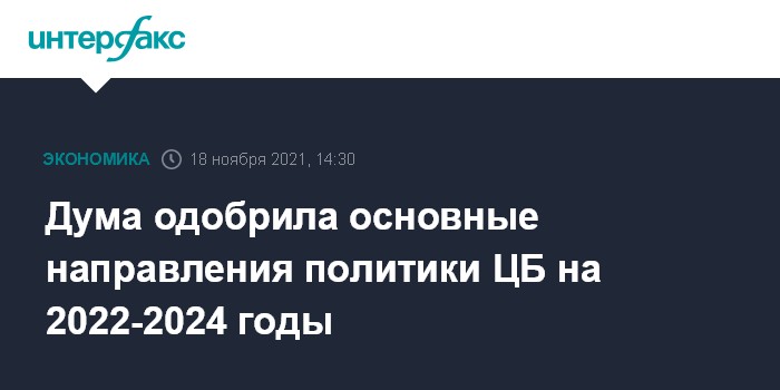 Москва. 18 ноября. INTERFAX.RU - Госдума одобрила подготовленные Банком России основные направления единой государственной денежно-кредитной политики (ДКП) на 2022 - 2024 годы. В документе прописаны цели и подходы к реализации ДКП и отражен взгляд ЦБ на текущее состояние экономики и ее развитие в среднесрочной перспективе.