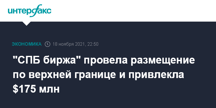 Москва. 18 ноября. INTERFAX.RU - "СПБ биржа" (бывшая "Санкт-Петербургская биржа") официально подвела итоги IPO, по итогам которого компания привлечет около $175 млн (предполагая, что опцион на выкуп не будет исполнен, и до вычета расходов на проведение размещения).