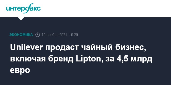 Москва. 19 ноября. INTERFAX.RU - Unilever Plc, один из мировых лидеров в производстве продуктов питания и товаров для дома, сообщил, что продаст чайный бизнес ekaterra, в том числе бренд Lipton, фонду CVC Capital за 4,5 млрд евро.
