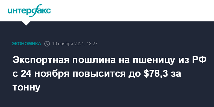 Москва. 19 ноября. INTERFAX.RU - Экспортная пошлина на пшеницу из РФ с 24 ноября повысится до $78,3 с $77,1 за тонну, сообщил Минсельхоз.