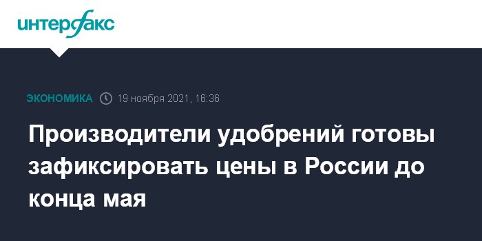 Москва. 19 ноября. INTERFAX.RU - Производители удобрений готовы продлить фиксацию цен для внутреннего рынка до конца мая 2022 года, заявил журналистам гендиректор "ФосАгро", глава Российской ассоциации производителей удобрений (РАПУ) Андрей Гурьев.