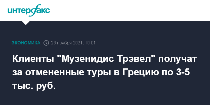 Москва. 23 ноября. INTERFAX.RU - Компании, работавшие под брендом "Музенидис Трэвел", направили данные о своих клиентах в страховую компанию "ТИТ", которая должна выплатить им возмещение за отмененные туры в Грецию. Об этом сообщила "Интерфаксу" во вторник пресс-секретарь Российского союза туриндустрии (РСТ) Ирина Тюрина.