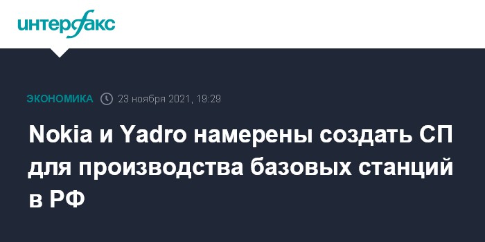 Москва. 23 ноября. INTERFAX.RU - Nokia и российский производитель серверов и систем хранения данных ООО "КНС групп" (бренд Yadro) намерены создать СП для производства базовых станций в РФ.