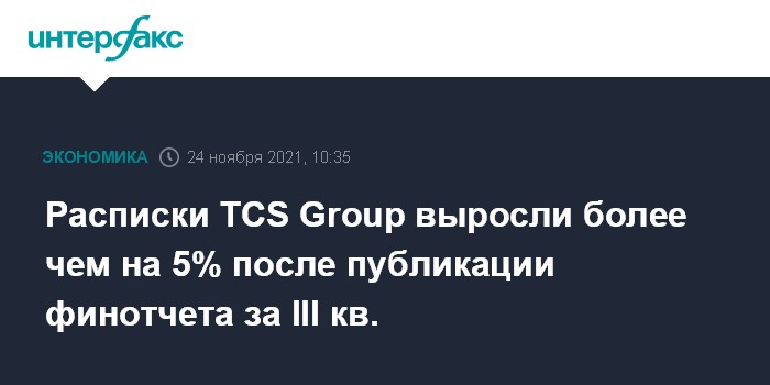 Москва. 24 ноября. INTERFAX.RU - Глобальные депозитарные расписки (ГДР) TCS Group выросли в начале торгов на Московской бирже в среду на 5,3% (до 7355,8 рубля за штуку) после публикации финансового отчета по МСФО за III квартал 2021 года.