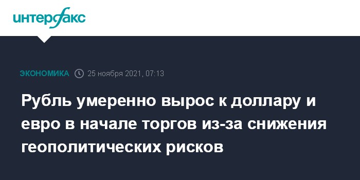 По мнению экспертов "Интерфакс-ЦЭА", умеренное укрепление рубля к доллару и евро на старте торгов 25 ноября обусловлено, прежде всего, локальным снижением геополитических рисков, которое произошло после ряда сообщений в западных СМИ. При этом ситуация на мировых рынках капитала, в том числе на нефтяных площадках, в четверг утром неоднозначная и противоречивая (в США финансовые рынки 25 ноября работать не будут в связи с праздником - Днем благодарения).