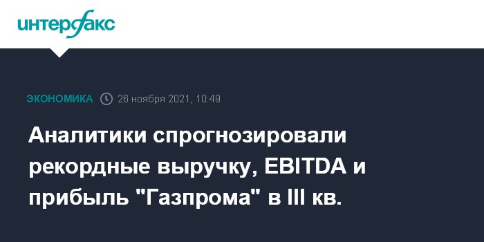 Москва. 26 ноября. INTERFAX.RU - "Газпром" в третьем квартале 2021 года, как ожидается, установил новые рекорды по всем основным показателям консолидированной отчетности, выраженным в рублях, - выручке, EBITDA и чистой прибыли. И все это на фоне весьма скромной по отношению к спотовым котировкам и историческим максимумам экспортной цены, свидетельствуют результаты консенсус-прогноза, подготовленного "Интерфаксом" на основе опроса 12 аналитиков.