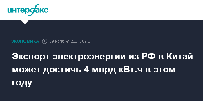 В 2020 г. объемы экспорта российской электроэнергии в Китай составили 3,06 млрд кВт.ч (-1,3% к 2019 году). В январе-сентябре 2021 г. поставки выросли на 3,2%, до 2,48 млрд кВт.ч.