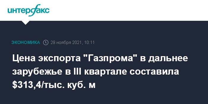 Москва. 29 ноября. INTERFAX.RU - Ключевой для отчетности "Газпрома" показатель - цена экспорта газа в страны дальнего зарубежья - в третьем квартале 2021 года составил $313,4 за тысячу кубометров (консенсус-прогноз "Интерфакса" $318,7) после $224,4 во втором и $193,9 в первом квартале, следует из отчета компании.