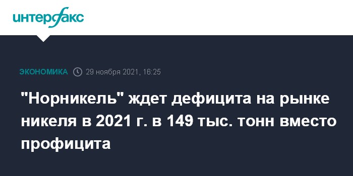 Москва. 29 ноября. INTERFAX.RU - Рынок никеля будет дефицитным в 2021 году в объеме около 149 тыс. тонн, следует из опубликованного в понедельник обзора рынка, подготовленного экспертами "Норникеля" и ICBC Standard Bank.