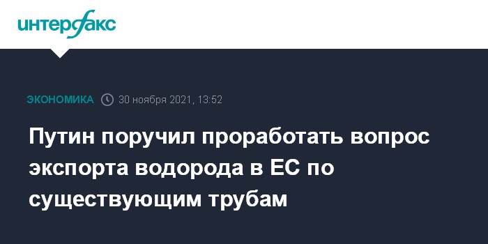 Москва. 30 ноября. INTERFAX.RU - Президент РФ Владимир Путин поручил правительству совместно с "Газпромом" при участии МИДа России проработать вопросы о возможности экспорта в страны Европейского союза водорода в составе метано-водородной смеси на базе действующих трубопроводных систем и признании такого водорода соответствующим требованиям таксономии Европейского союза.
