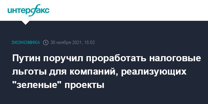 Путин поручил проработать налоговые льготы для компаний, реализующих "зеленые" проекты