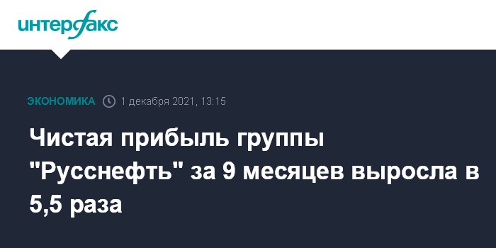 Москва. 1 декабря. INTERFAX.RU - Чистая прибыль по группе компаний "Русснефть" (с учётом четырёх филиалов) за девять месяцев 2021 года составила 23,556 млрд рублей против 4,31 млрд рублей за аналогичный период год назад.