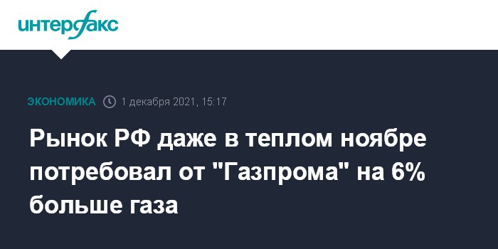 Москва. 1 декабря. INTERFAX.RU - Рост спроса на газ "Газпрома" в РФ в теплом ноябре 2021 года замедлился - после 30% в сентябре и октябре он составил лишь 6%, но в абсолютных значениях поставки на российский рынок - максимальные с 2011 года.