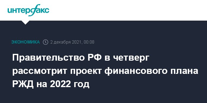 Москва. 2 декабря. INTERFAX.RU - Правительство РФ в четверг рассмотрит проект финансового плана и инвестиционной программы ОАО "Российские железные дороги" на 2022 год и последующую двухлетку, сообщила пресс-служба кабинета министров.