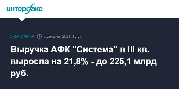 Москва. 2 декабря. INTERFAX.RU - Выручка ПАО АФК "Система" в III квартале 2021 года составила 225,12 млрд рублей, увеличившись год к году на 21,8%, говорится в отчетности компании.