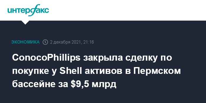 Москва. 2 декабря. INTERFAX.RU - Американская компания ConocoPhillips закрыла сделку по покупке у британо-нидерландкой Royal Dutch Shell активов в Пермском бассейне примерно за $9,5 млрд.
