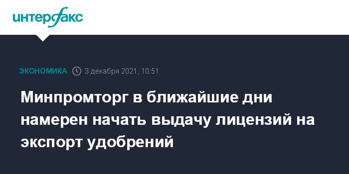 Эту информацию подтвердил и собеседник "Интерфакса", присутствовавший на прошедшем 1 декабря совещании под председательством министра сельского хозяйства Дмитрия Патрушева. По его данным, экспортные лицензии обещают выдать примерно 5-6 декабря. Однако уже сейчас ряд заводов по выпуску минудобрений, преимущественно азотных, вынуждены сокращать загрузку мощностей, отметил он.