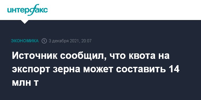 Москва. 3 декабря. INTERFAX.RU - Квота на экспорт зерна из России, которая начнет действовать с 15 февраля 2022 года, может составить 14 млн тонн, в том числе 9 млн тонн пшеницы, сообщили "Интерфаксу" источник на зерновом рынке, знакомый с обсуждением предложений.