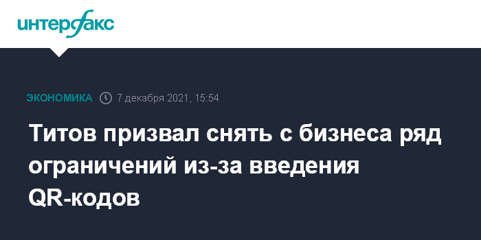 Москва. 7 декабря. INTERFAX.RU - Введение системы QR-кодов в общественных местах должно повлечь снятие дополнительных ограничений с бизнеса, считает уполномоченный при президенте РФ по защите прав предпринимателей Борис Титов.