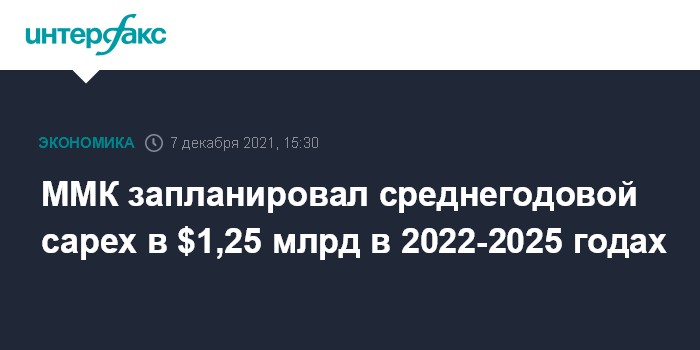 Москва. 7 декабря. INTERFAX.RU - "Магнитогорский металлургический комбинат" (ММК) ожидает среднегодовой capex в период с 2022 по 2025 год на уровне около $1,25 млрд, следует из презентации компании ко Дню инвестора.