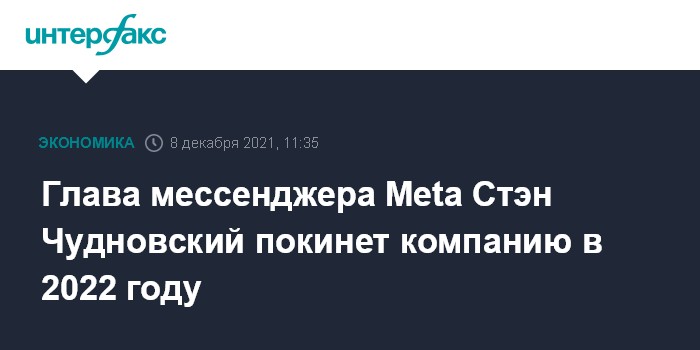 Москва. 8 декабря. INTERFAX.RU - Вице-президент Meta Platforms Inc (ранее Facebook) Стэн Чудновский, отвечающий за интегрированное с соцсетью Facebook приложение для обмена сообщениями Messenger, сообщил о планах покинуть компанию во втором квартале следующего года.