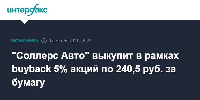 Как сообщалось, группа "Соллерс Авто" объявляла buyback осенью прошлого года. Совет директоров компании на заседании 23 октября 2020 г. утвердил программу обратного выкупа 5% размещенных акций (1,713 млн шт.) по 267 руб. за шт. После объявления buyback акции компании в тот же день упали на МосБирже на 8,5%. По данным сайта биржи, цена одной акции компании на момент открытия торгов 23 октября 2020 г., до объявления планов выкупа, составляла 286 руб. за штуку. Цена одной акции на момент закрытия торгов 15 января 2021 г. составила 265 руб. за штуку.