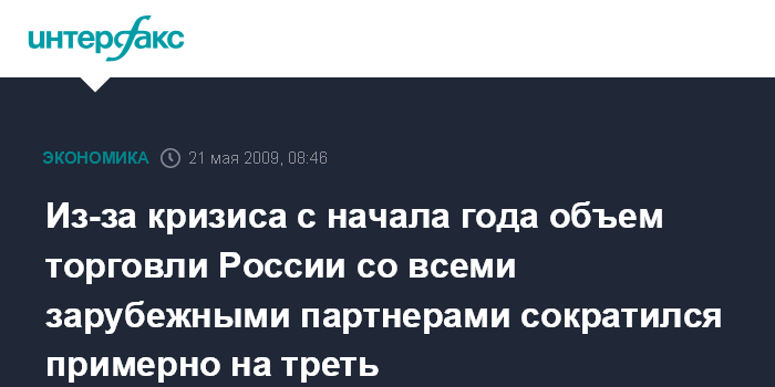 Москва. 21 мая. INTERFAX.RU - Торговый оборот России со всеми зарубежными партнерами с начала года сократился примерно на одну треть, сообщил президент РФ Дмитрий Медведев.