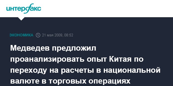 Москва. 21 мая. INTERFAX.RU - Президент РФ Дмитрий Медведев считает интересной инициативу Китая по переходу на расчеты в национальной валюте при торговых операциях.