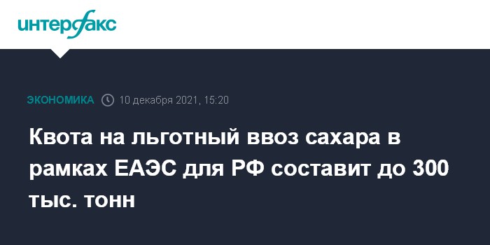 Коллегия ЕЭК совместно с государствами Союза будет мониторить мировые и средние контрактные цены и фактический объем ввоза сахара с применением тарифной льготы, а также объемы реализации на внутреннем рынке стран ЕАЭС. Результаты будут доложены Совету комиссии в марте-апреле 2022 года, говорится в сообщении.