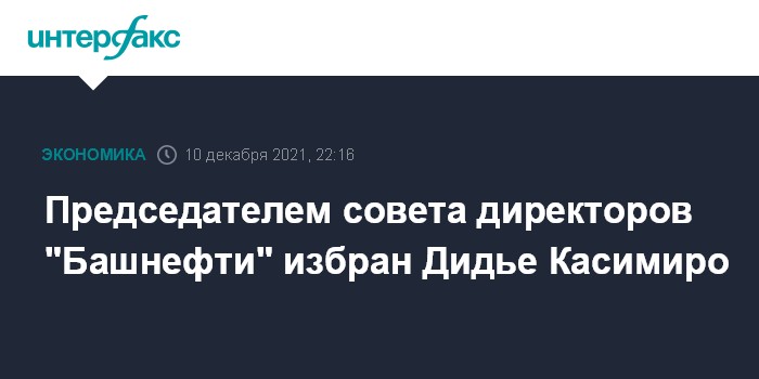 Москва. 10 декабря. INTERFAX.RU - Председателем совета директоров "Башнефти" избран первый вице-президент "Роснефти" Дидье Касимиро, сообщила компания.