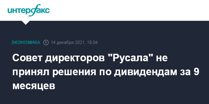 Москва. 14 декабря. INTERFAX.RU - Совет директоров "Русала" не смог принять решение по вопросу выплат дивидендов за 9 месяцев 2021 года в связи с отсутствием консолидированной финансовой отчетности за этот период, сообщила компания.