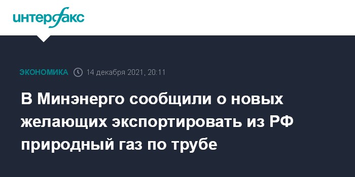 Москва. 14 декабря. INTERFAX.RU - Помимо "Роснефти" появились новые желающие экспортировать из России природный газ по трубопроводу, рассказал журналистам министр энергетики РФ Николай Шульгинов.