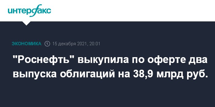 Москва. 15 декабря. INTERFAX.RU - "Роснефть" в рамках оферты выкупила 19 млн 709,237 тыс. облигаций серии БО-05 и 19 млн 157,994 тыс. облигаций серии БО-06 по цене 100% от номинала, говорится в сообщениях эмитента.