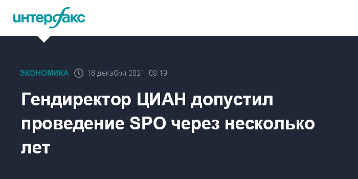 Москва. 16 декабря. INTERFAX.RU - В течение нескольких лет может состояться вторичное размещение акций (SPO) сервиса по аренде и продаже недвижимости ЦИАН за счет продажи долей фондов прямых инвестиций; free-float может увеличиться до 50% с 25-28% в настоящее время, сообщил РБК гендиректор и акционер компании Максим Мельников.