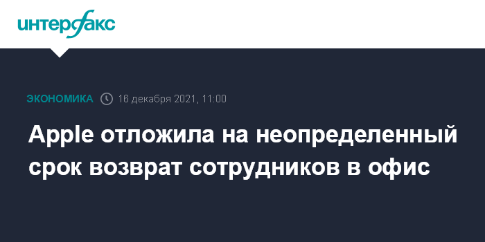 Москва. 16 декабря. INTERFAX.RU - Корпорация Apple Inc. в условиях пандемии снова отложила возвращение сотрудников в офис в связи с растущей обеспокоенностью по поводу распространения нового штамма коронавируса "омикрон". Как пишет The Wall Street Journal со ссылкой на источник, офисным сотрудникам компании объявили об этом 15 декабря.