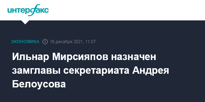 Москва. 16 декабря. INTERFAX.RU - Ильнар Мирсияпов назначен заместителем руководителя секретариата первого вице-премьера Андрея Белоусова, сообщил "Интерфаксу" источник в аппарате правительства.