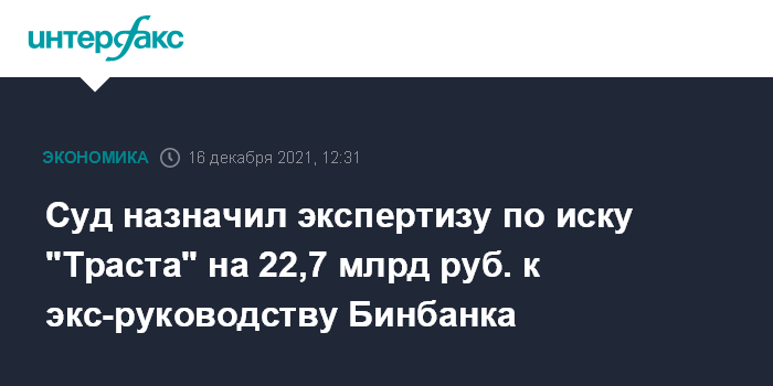 Москва. 16 декабря. INTERFAX.RU - Арбитражный суд Москвы 13 декабря назначил судебную финансово-экономическую экспертизу по иску банка "Траст" к бывшим топ-менеджерам Бинбанка на 22,7 млрд рублей.