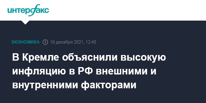 Москва. 16 декабря. INTERFAX.RU - В Кремле объяснили высокую инфляцию в РФ давлением внешних и внутренних факторов, ставят задачу как можно быстрее вернуться к запланированным показателям.