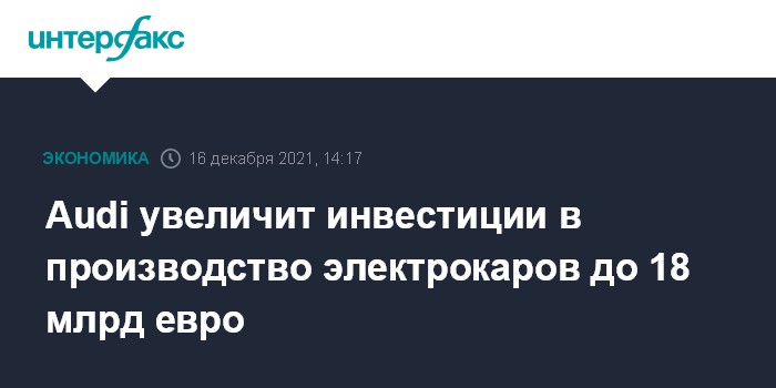 Москва. 16 декабря. INTERFAX.RU - Германский автопроизводитель Audi AG сообщил, что планирует увеличить инвестиции в производство электрокаров и гибридных автомобилей до 18 млрд евро с прежних 15 млрд евро в 2022-2026 годах. Эта сумма входит в расчет совокупных инвестиций компании в НИОКР объемом 37 млрд евро.