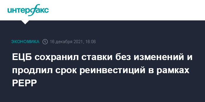 Москва. 16 декабря. INTERFAX.RU - Европейский центральный банк (ЕЦБ) по итогам заседания в четверг ожидаемо сохранил базовую процентную ставку по кредитам на нулевом уровне, ставку по депозитам - на уровне минус 0,5%.