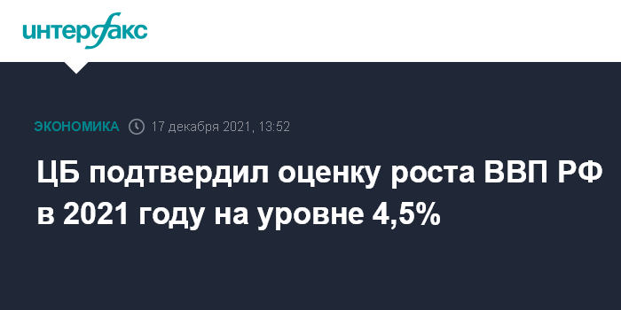 Москва. 17 декабря. INTERFAX.RU - Банк России ожидает роста ВВП РФ в 2021 году на уровне около 4,5%. Об этом говорится в сообщении ЦБ, опубликованном по итогам заседания совета директоров.