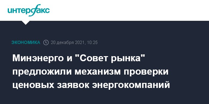Москва. 20 декабря. INTERFAX.RU - Минэнерго РФ и "Совет рынка" (регулятор энергорынков) предложили подходы к формированию методики проверки экономической обоснованности ценовых заявок энергокомпаний на рынке на сутки вперед (РСВ), рассказал "Интерфаксу" глава министерства Николай Шульгинов.