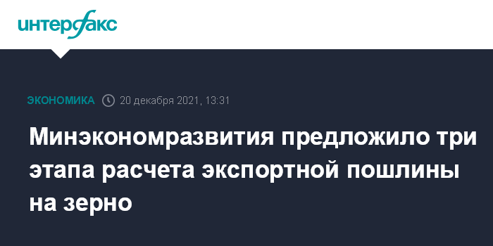 Москва. 20 декабря. INTERFAX.RU - Минэкономразвития РФ, заявившее на прошлой неделе о возможности точечной корректировки механизма расчета экспортных пошлин на зерно в случае резкого повышения мировых цен, предложило три "планки" для ее расчета, следует из проекта постановления правительства и приложений к нему, размещенных на сайте информации о подготовке нормативных правовых актов.