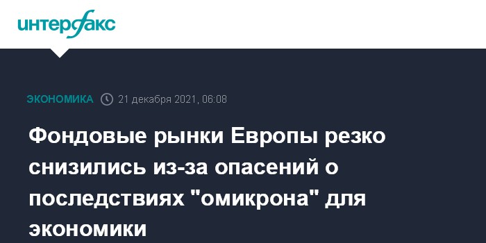 Москва. 21 декабря. INTERFAX.RU - Европейские фондовые рынки завершили первые торги этой недели резким падением в связи с растущими опасениями, что распространение нового штамма COVID-19 "омикрон" потребует ужесточения карантинных мер по всему миру и ослабит экономический рост.
